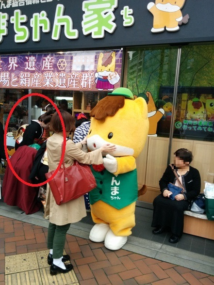 群馬のアンテナショップがあって、芸子さんの格好をした女性達(赤で丸をしたところの人達)が、群馬のパンフレットやタオルを配っていました。