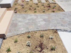 なるべくお手入れがラクで、鉄平石のアプローチにも合う植物を・・・ということで、シバザクラをメインに植え付け。