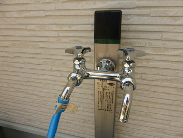 「水遣りのためのホースをつけたりはずしたりが面倒」ということで、立水栓の蛇口を2口のものに交換させていただきました。