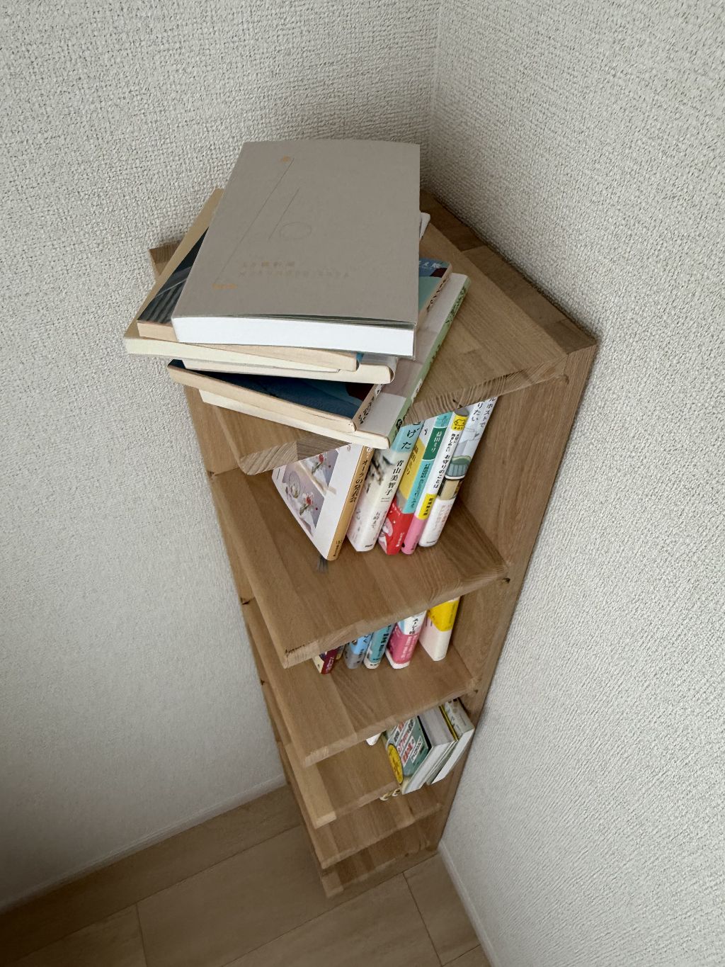 部屋の角に収まってほしかったので、びたっとハマるコーナーの本棚、とっても使えて イイです👍
