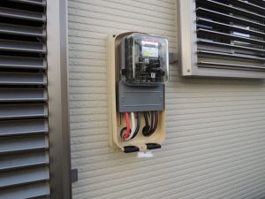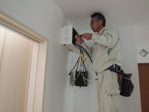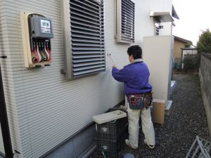 太陽光で発電した電気を売るメーターの取り付け作業をしています。