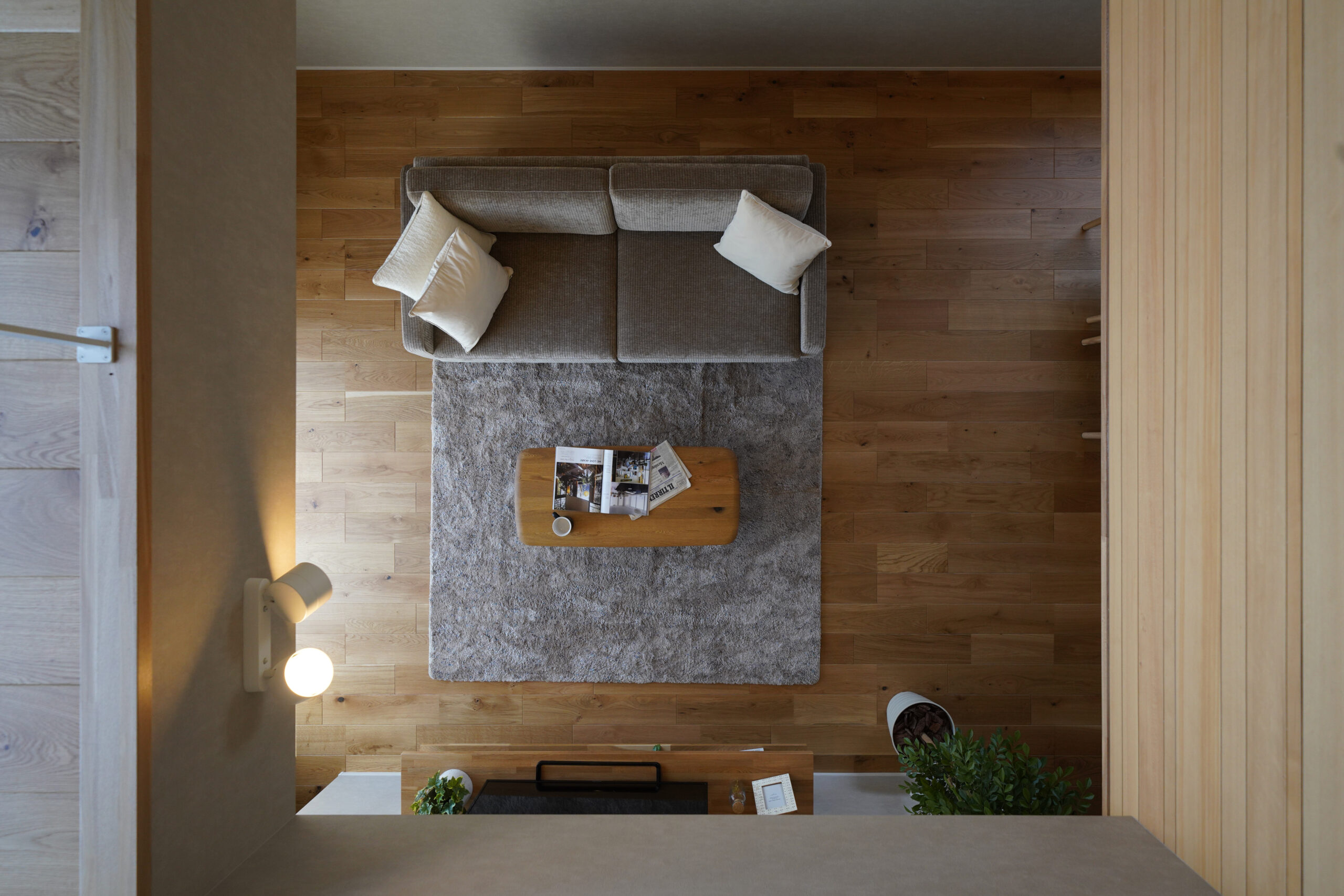 リビングは吹き抜けから朝日が降り注ぎ、部屋じゅうが明るく暖かい空間に。