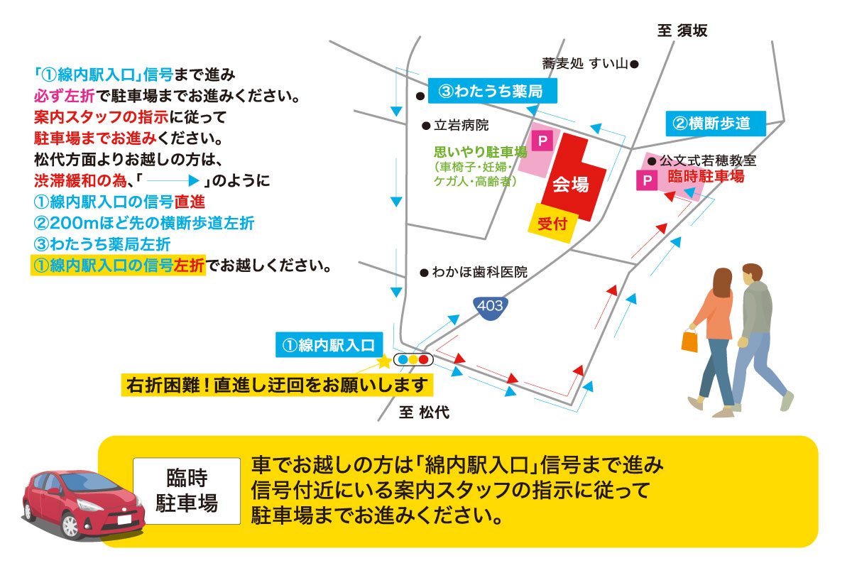 臨時駐車場までは、案内板または現地スタッフの案内に従いお越しください。