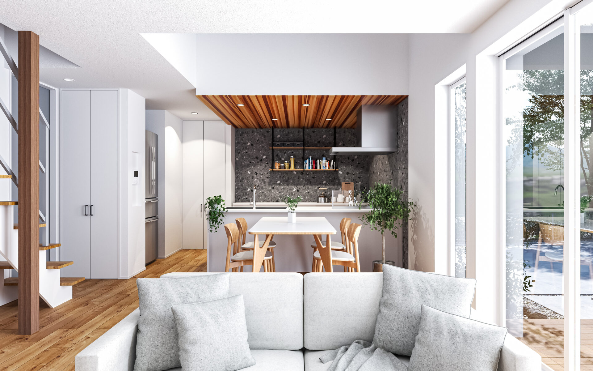 リビングの窓を開ければ、そこは家族だけのプライベートテラス。高い壁が外からの視線をやさしく遮り、人目を気にせず過ごせる特別な空間です。
