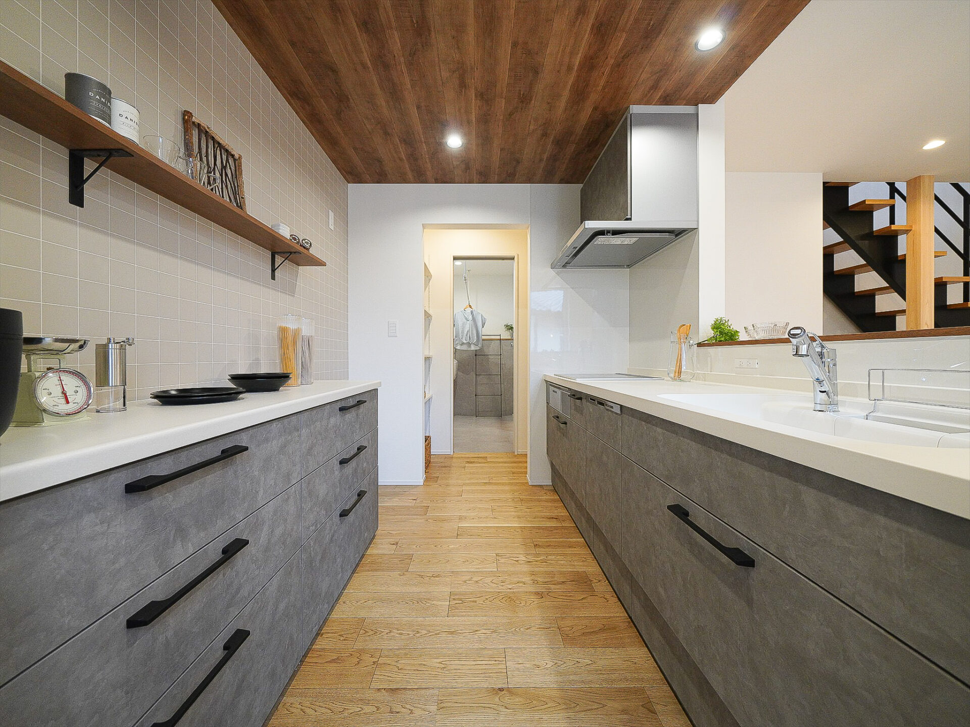 ホールから脱衣室、パントリーを通ってキッチンへと続く動線で、買い物も洗濯も効率的に。