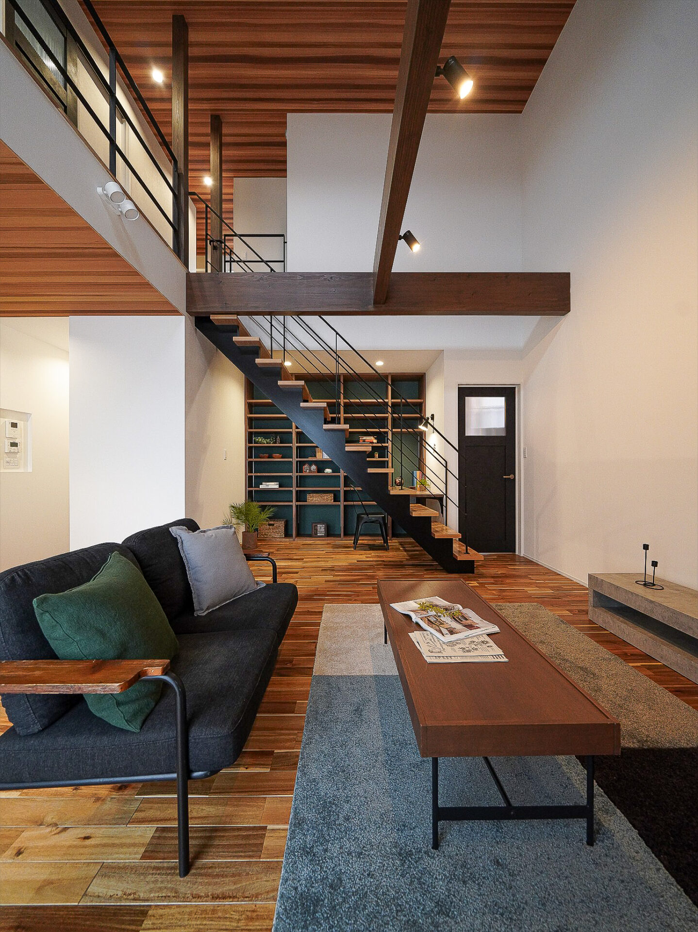 吹抜けのあるリビングに入った瞬間、空間のひろがりを感じる。高さのある天井と、奥まで抜ける視線が生み出す開放感。部屋全体が一体となったような伸びやかさが、心をゆったりと包み込む