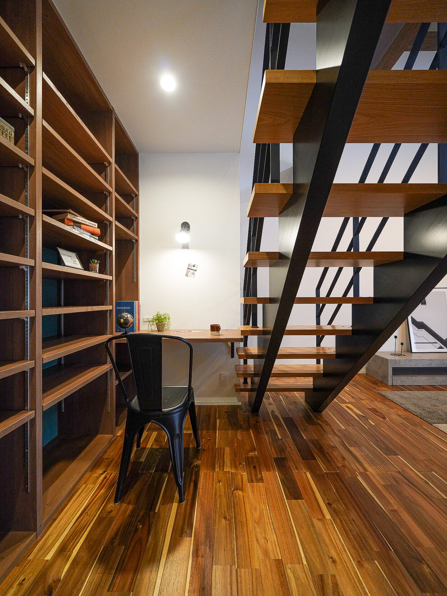 リビング横の本棚&書斎スペース。同じ空気を吸いながら、それぞれの時間を楽しむ。