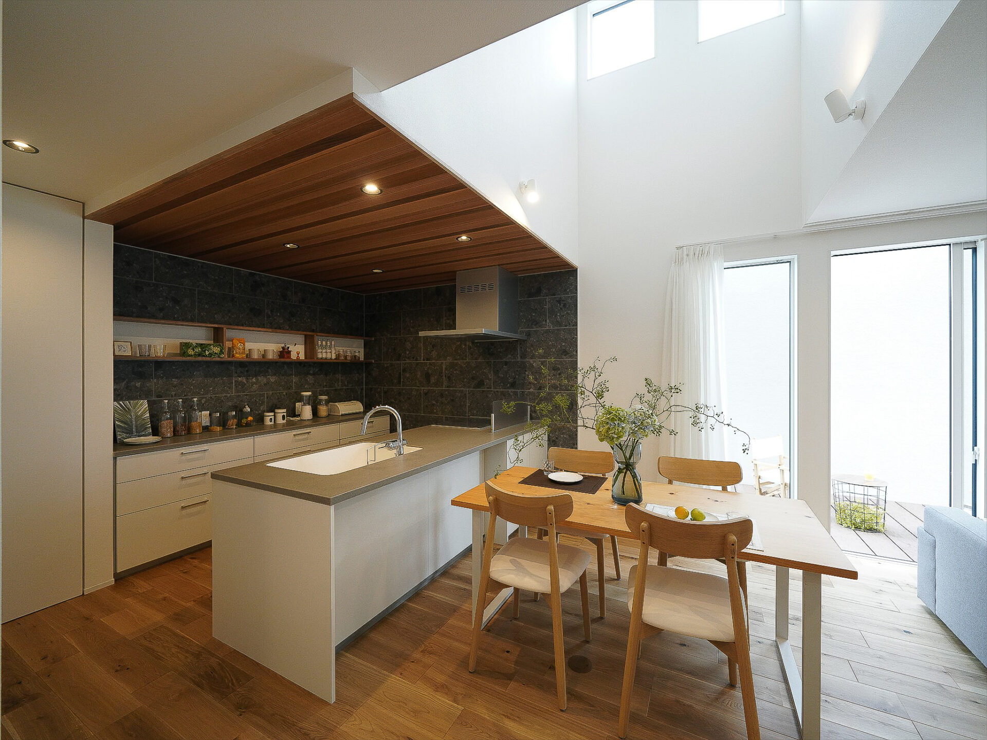 木の天井が包み込むキッチンは、毎日の料理の時間がもっと楽しくなる特別な空間です。
