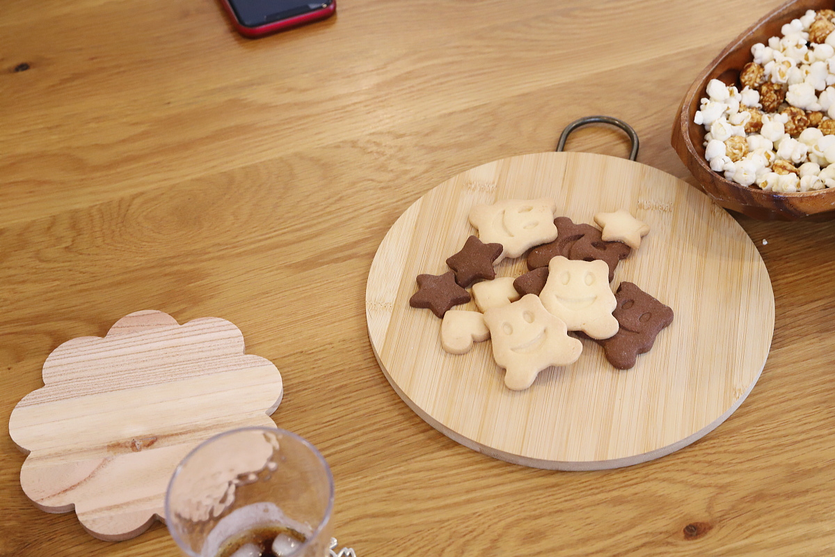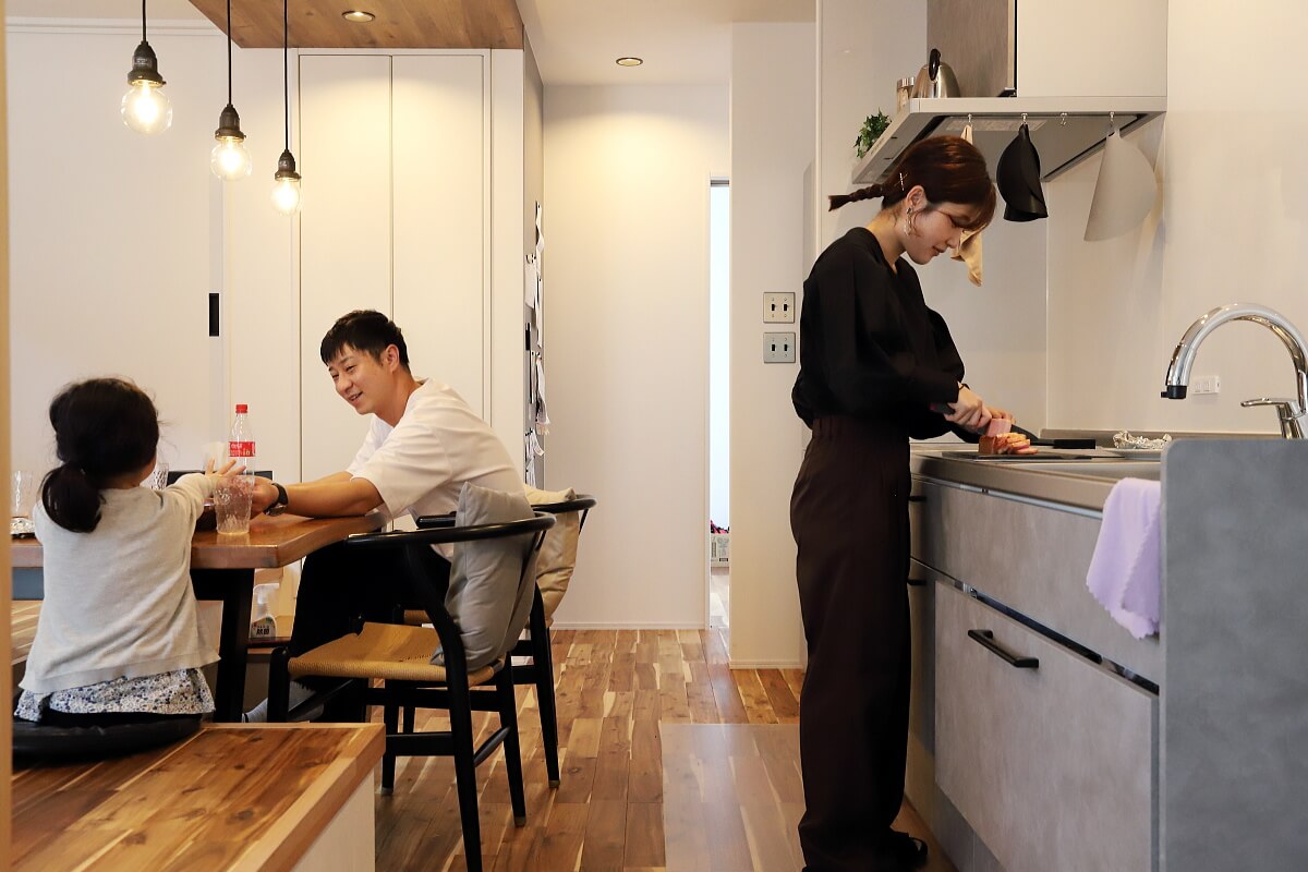 平屋で家の面積が限られる中で、リビングは広めがいいって考えて、キッチンは壁付けにしました。前の家でもそうでしたし、料理に集中できるのでとても良いです。すぐ隣にカップボードがあるので使いやすいですし、一歩後ろを向けばすぐダイニングテーブルがあるので料理を出すのもめちゃくちゃ楽です!(笑)