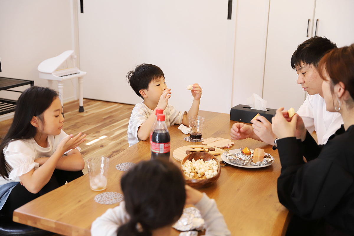 前の家が畳でイスに座る習慣があまり無くて…。 食事以外でも子供たちがここでゲームをしたり、大人は夜になったら好きなところに座ってお酒を呑んだり、自由な使い方ができるので作って良かったです。