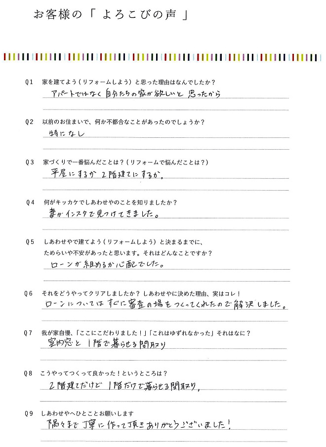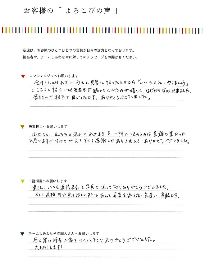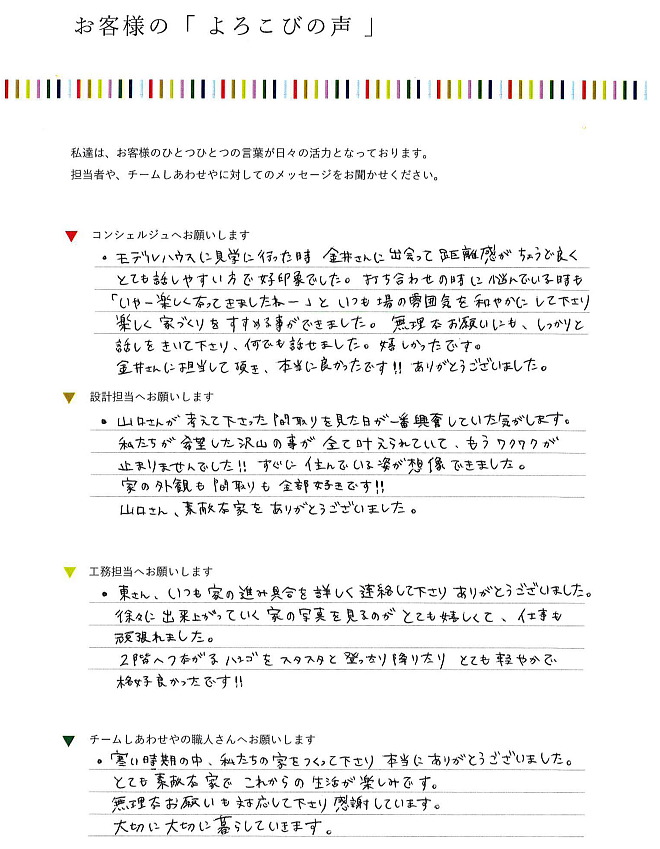 ・素敵な家を建てて頂きました。しあわせやさんにお願いして本当に良かったです。本当にありがとうございました。