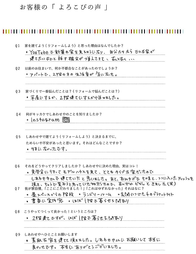 ・見学会に行ってモデルハウスを見て、とてもタイプな家だったのでしあわせやさんで建てたい!!と思いました。