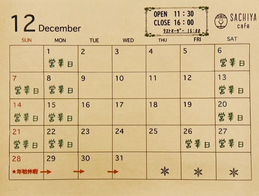 🎄『SACHIYAcafe 12月の営業日カレンダー』です🤶