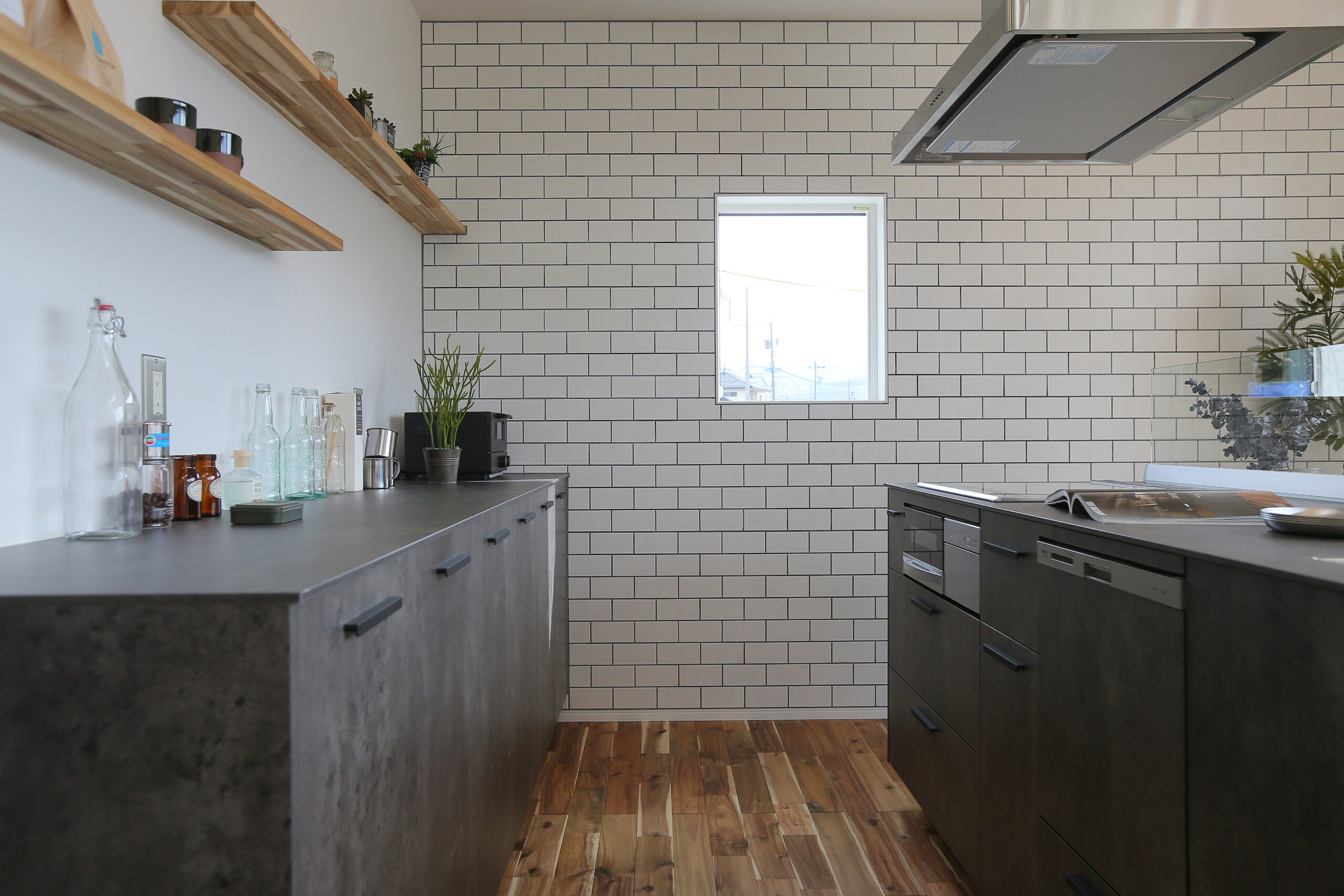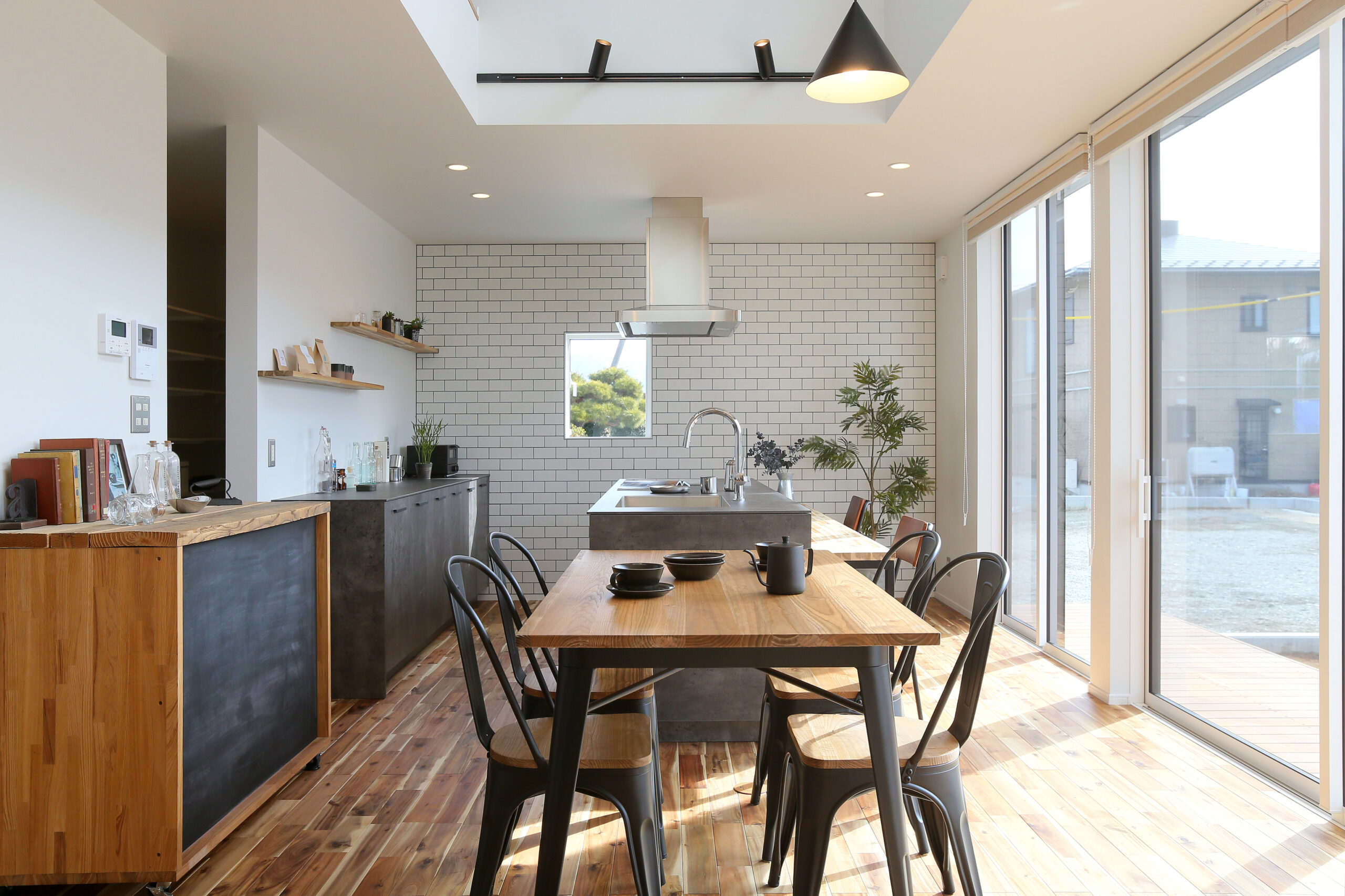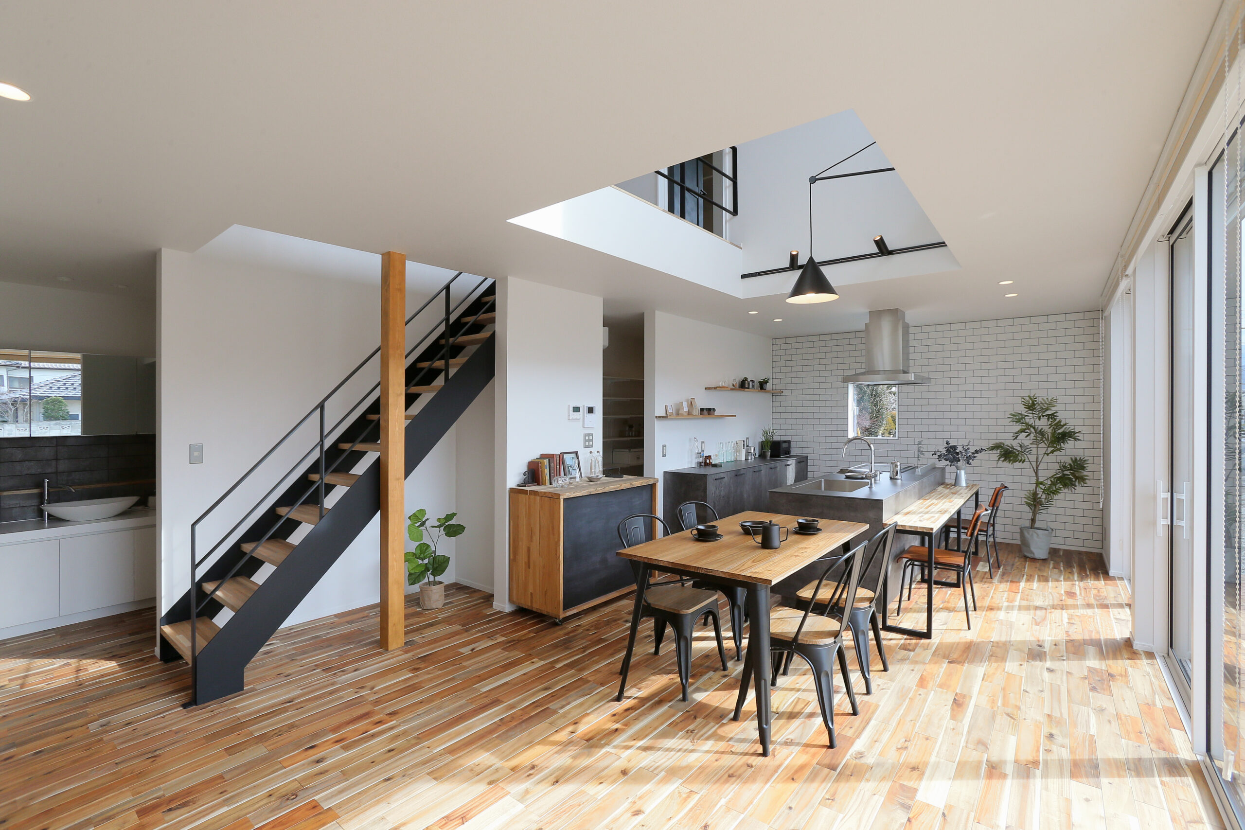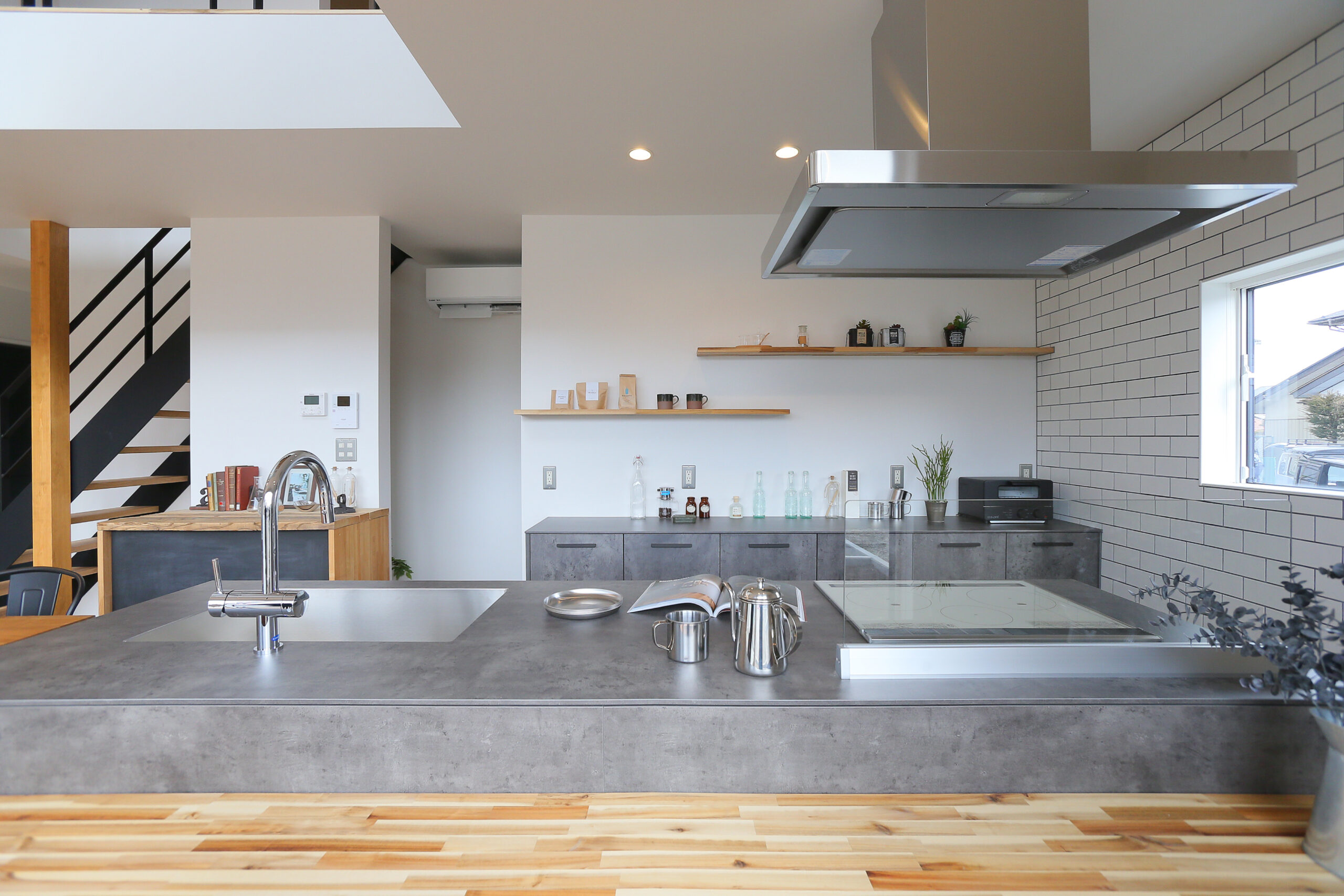 まるで「ブルックリンのカフェ」のようなLDK。表情豊かな無垢材の床に、空間を引き締めるアイアン階段とヘリンボーンの壁。モルタル調のアイランドキッチンにはサブウェイタイルを合わせ、ヴィンテージ感溢れる空間に仕上げました。 見せる収納に並べたお気に入りのコーヒー器具を使い、自宅で豆を挽く香り豊かな週末の朝。お気に入りの音楽を流しながら、ゆっくりと自分の時間を味わうことができます。 「休日は家で遊ぶのが一番楽しい!」と、思わず言いたくなる。毎日の何気ない時間が、とっておきの趣味に変わるようなライフスタイルを叶える住まいです。