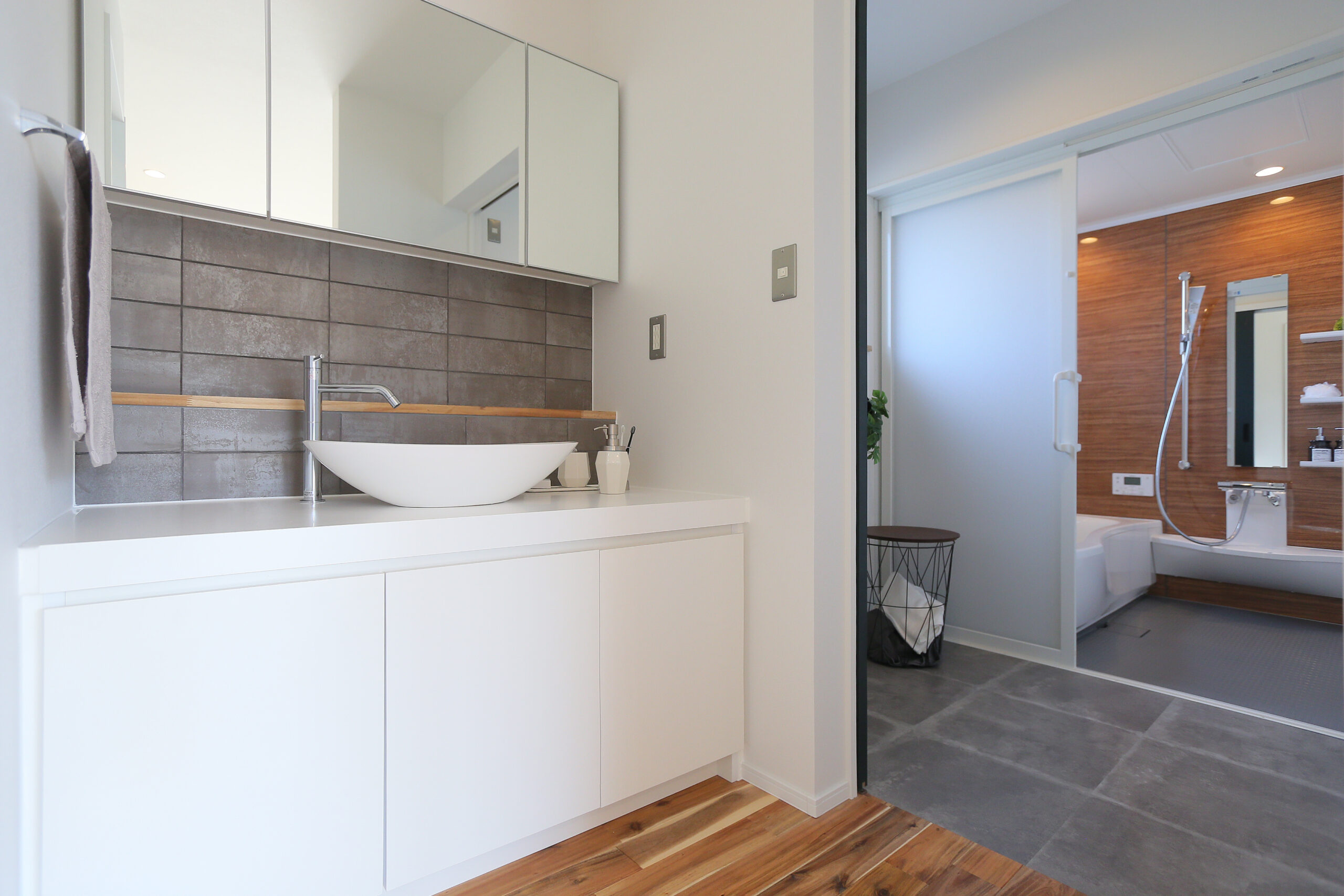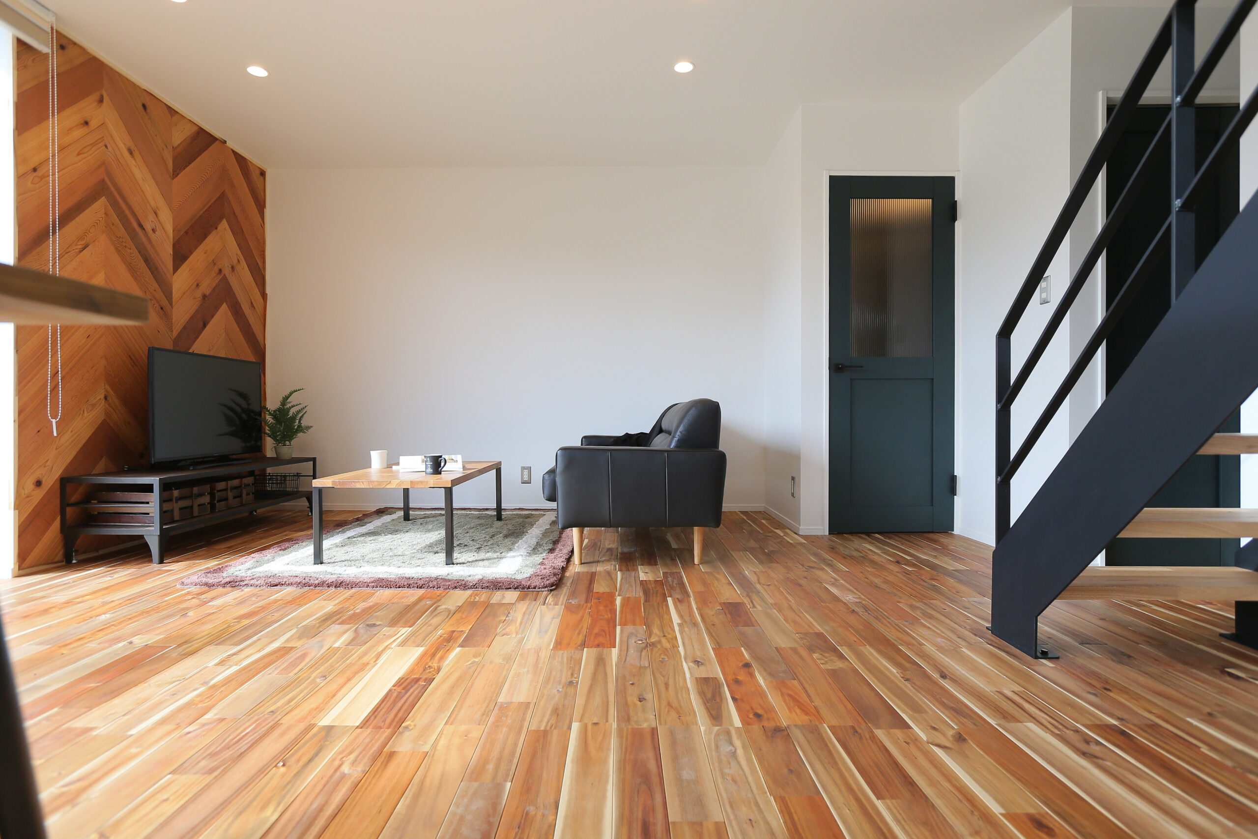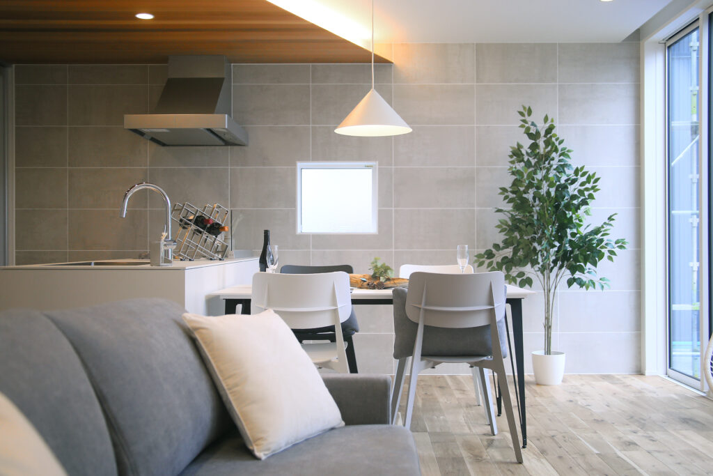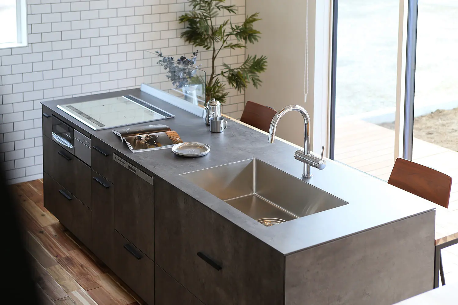 まるで「ブルックリンのカフェ」のようなLDK。表情豊かな無垢材の床に、空間を引き締めるアイアン階段とヘリンボーンの壁。モルタル調のアイランドキッチンにはサブウェイタイルを合わせ、ヴィンテージ感溢れる空間に仕上げました。 見せる収納に並べたお気に入りのコーヒー器具を使い、自宅で豆を挽く香り豊かな週末の朝。お気に入りの音楽を流しながら、ゆっくりと自分の時間を味わうことができます。 「休日は家で遊ぶのが一番楽しい!」と、思わず言いたくなる。毎日の何気ない時間が、とっておきの趣味に変わるようなライフスタイルを叶える住まいです。