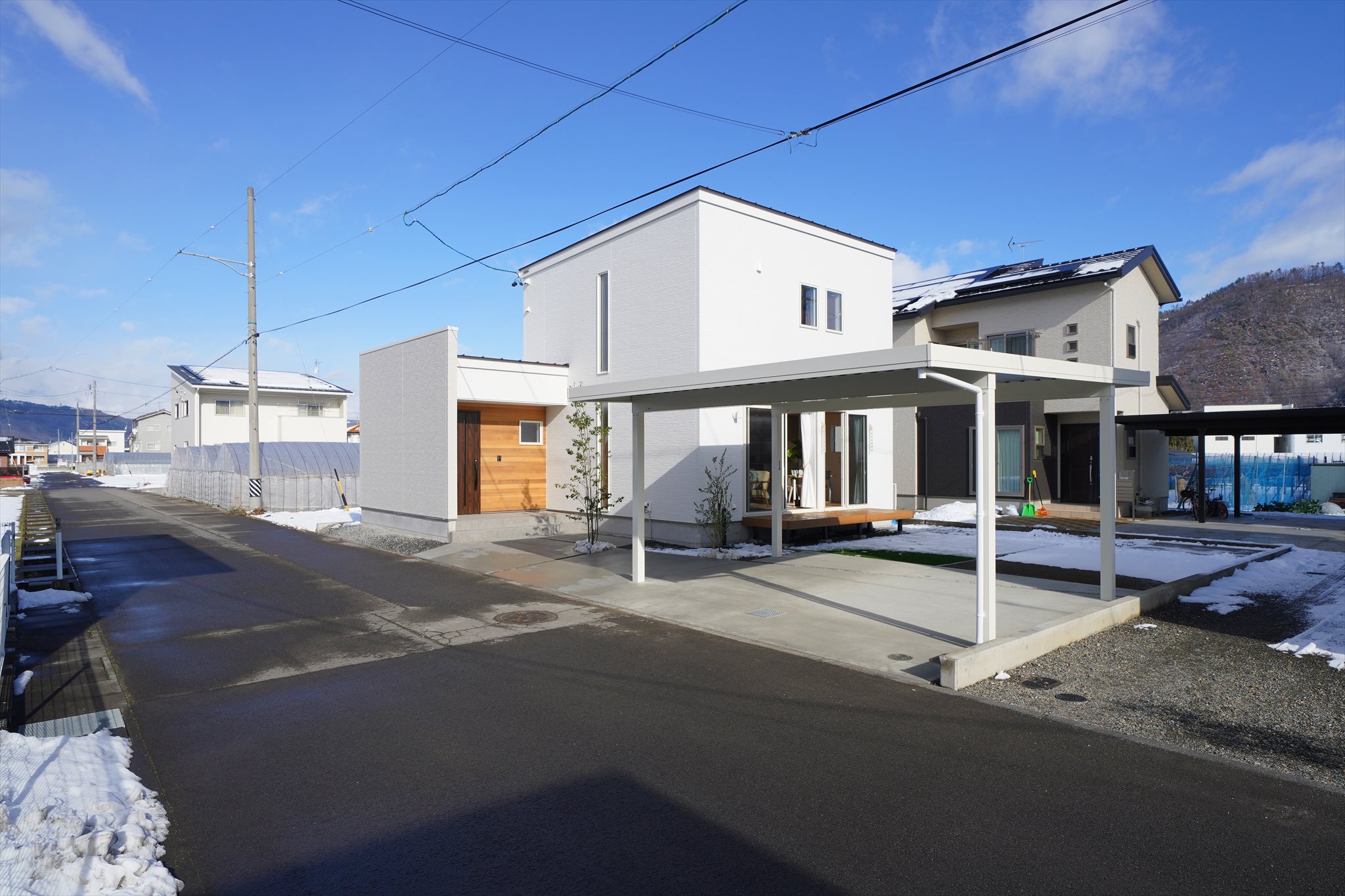 白い外壁に木目を合わせ、やわらかく上品な印象に仕上げました。