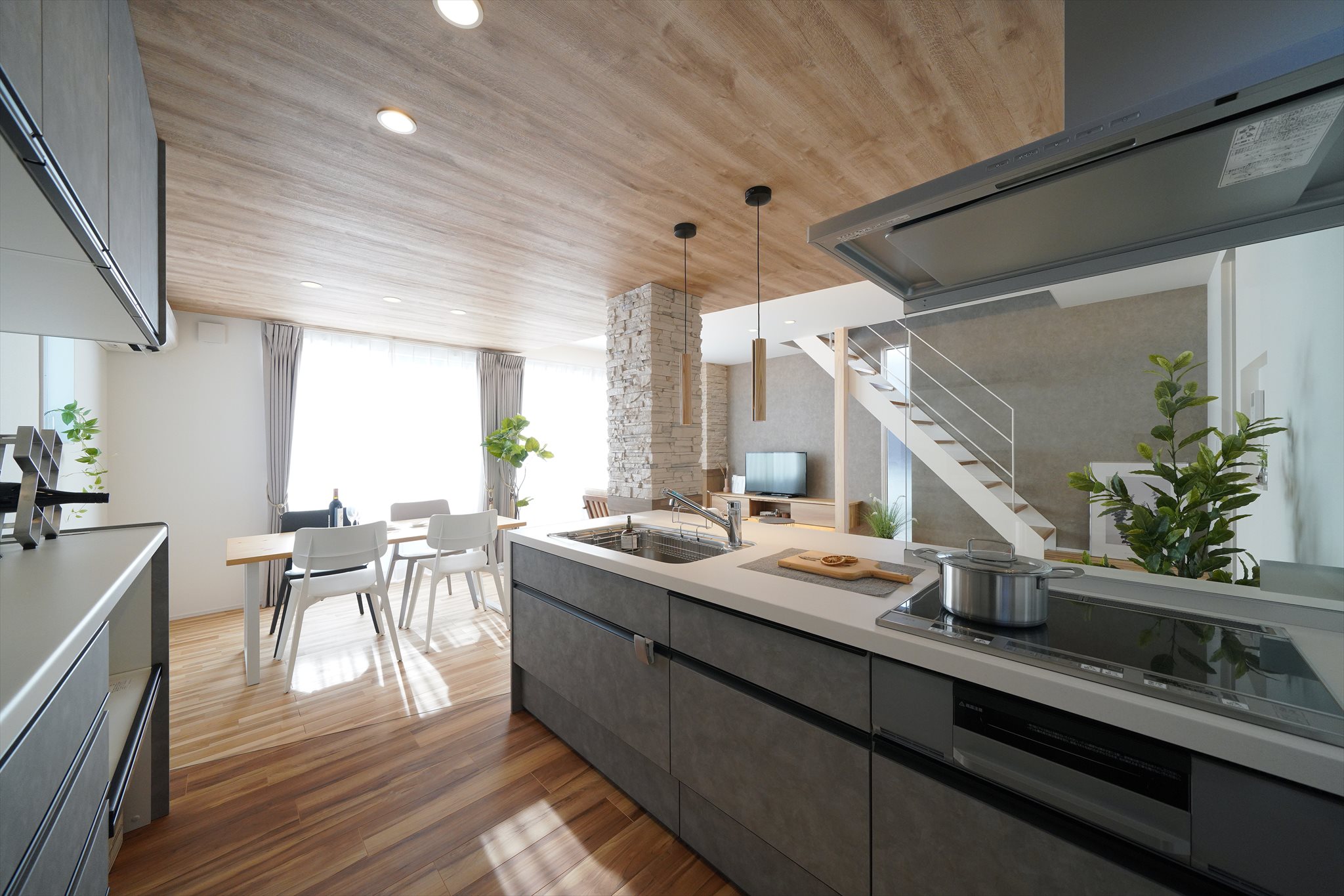木目やグレイッシュカラー、石貼りタイルが空間に表情を添えます。